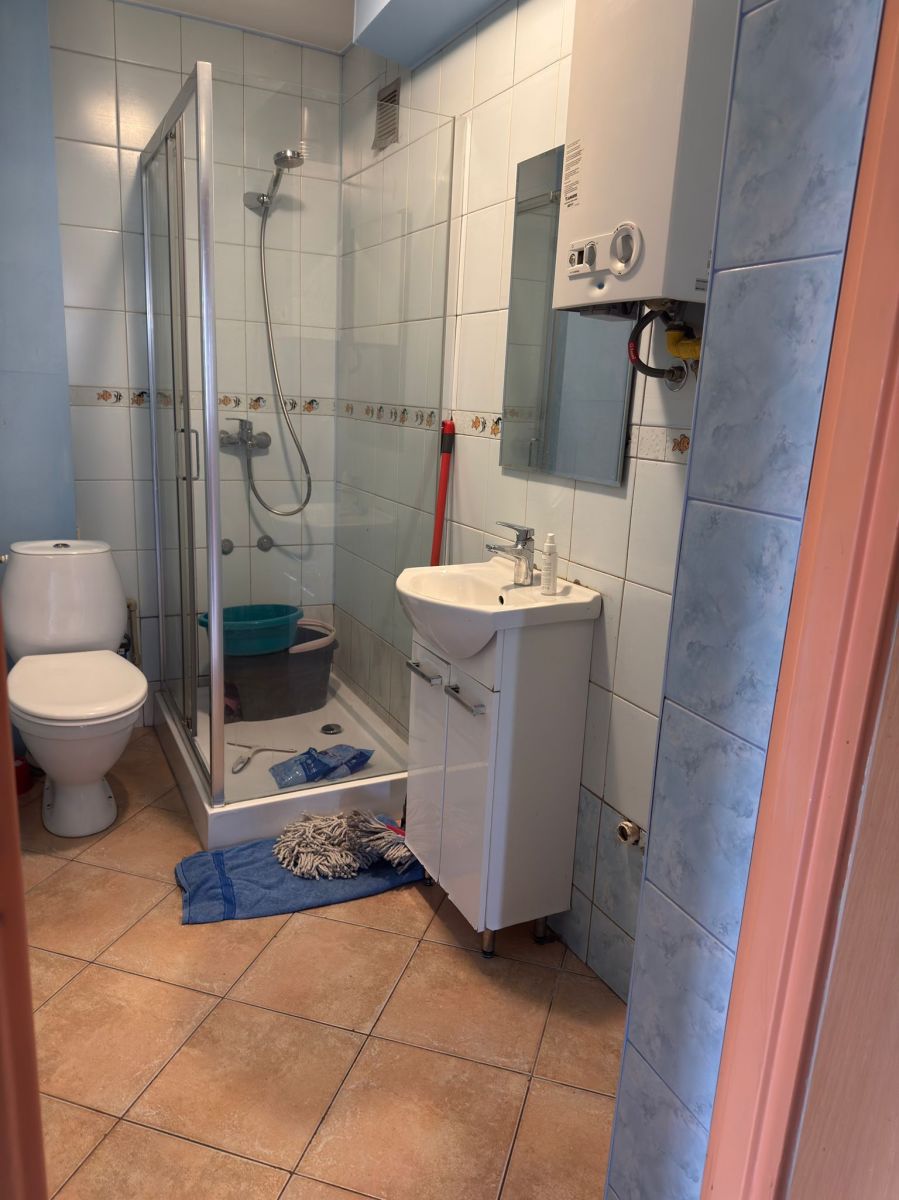 - Łazienka z WC wyłożona płytkami do sufitu, co zapewnia łatwość utrzymania czystości.